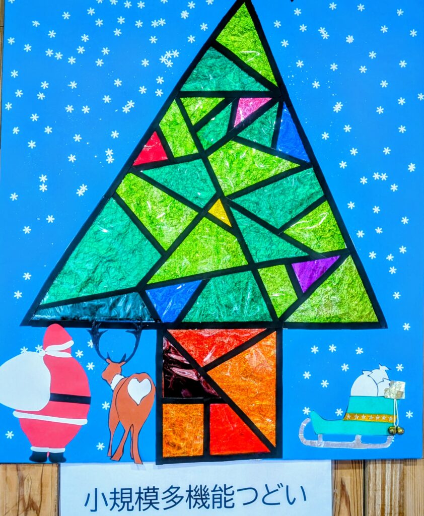小規模多機能つどいの利用者さんたちで楽しく製作しました。透明なセロファンにマッキーで色を塗り、アルミホイルをくしゃくしゃにして広げて張り合わせたら素敵なツリーが完成!明かりをつけるとセロファンがピカピカ光って素敵です!西館1号館の入り口に飾ってるから見に来てね!